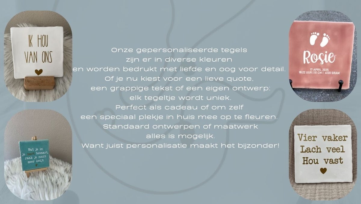 De mooiste items voor alle leeftijden. Gepersonaliseerd of basic, kraamcadeau's, stickers en de mooiste producten voor de feestdagen. Maatwerk is bij ons ook een optie