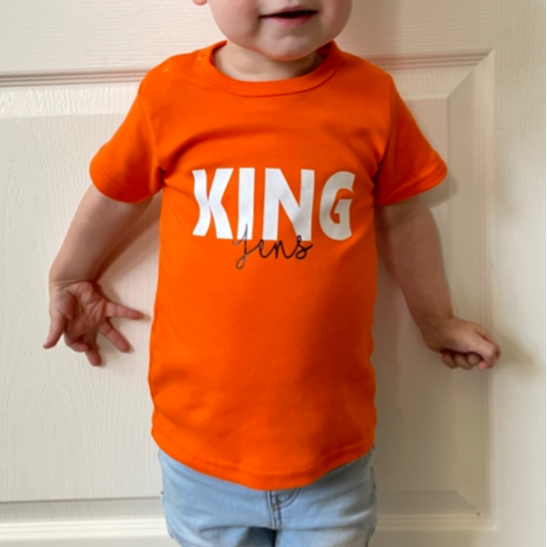 Dit shirtje kan niet ontbreken op koningsdag. De naam maakt het shirtje uniek. Liever geen naam erop? Geef dit dan aan met het bestellen. Je ontvangt dan een shirtje met alleen KING