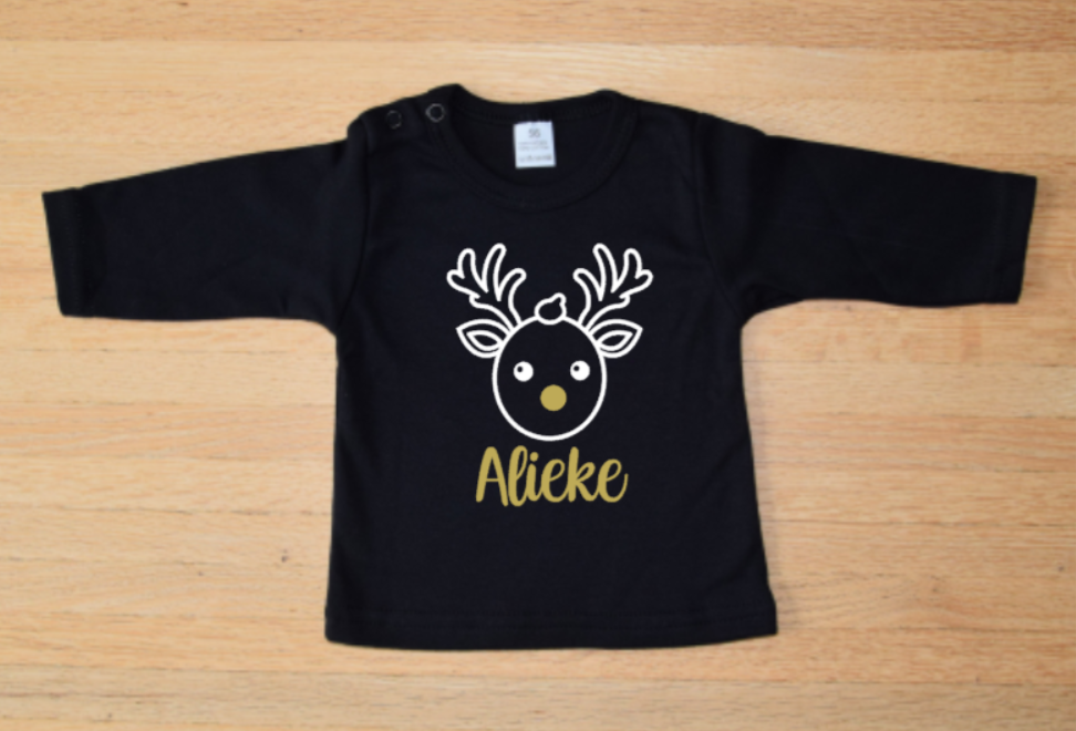 Dit shirtje met een leuk rendiertje en de naam van je (klein) kindje is een musthave met kerst. Het shirtje is voorzien van een mooi rendiertje met een glitterneus en de naam in glitterstijl. Liever geen glitters maar een matte rode of gouden opdruk? Of liever geen naam? Geef dit gerust aan.