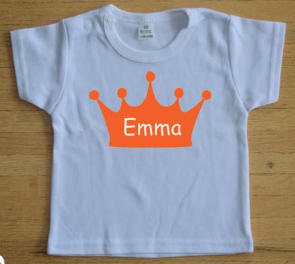 Dit shirtje kan niet ontbreken op koningsdag. De naam maakt het shirtje uniek. Liever geen naam erop? Geef dit dan aan met het bestellen. Je ontvangt dan een shirtje met alleen een kroon