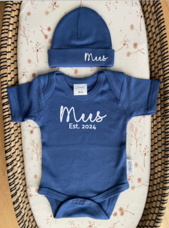 De opdruk op het mutsje en het rompertje hebben dezelfde kleur