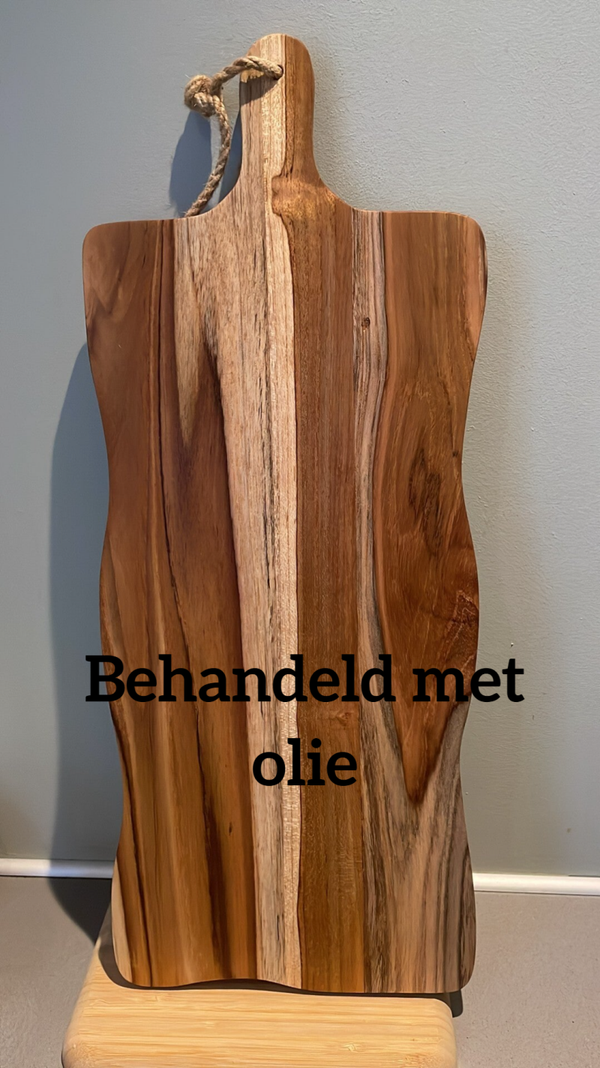 De planken worden speciaal voor jou gemaakt en kunnen daarom niet geretourneerd worden. Standaard leveren wij de serveerplanken onbehandeld, maar je kunt er tijdens het bestellen voor kiezen om de plank te laten behandelen met een plantaardige olie. Dit beschermt het hout en geeft het een rijkere kleur. Bekijk goed de afbeeldingen om het verschil tussen onbehandeld en behandeld teakhout te zien – dit maakt echt een groot verschil!