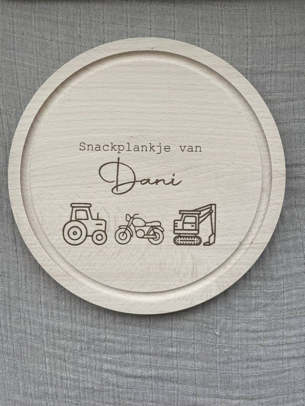 Een origineel, stoer én sfeervol item voor op tafel! Deze ronde beukenhouten plankjes zijn gegraveerd met toffe voertuigen zoals een vliegtuig, brandweerwagen, tractor of auto – leuk voor jong en oud. Perfect als persoonlijk boterhamplankje, serveerplank of als kraamcadeau. Indien gewenst kan er een geboortedatum op geplaatst worden. Stuur gerust een berichtje