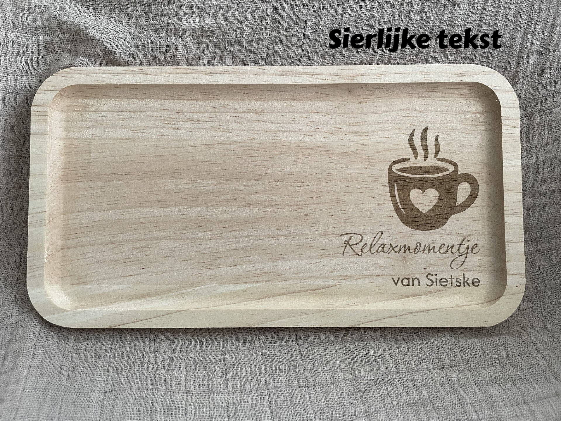 Geef dit prachtige koffieplankje met de gravure “relaxmomentje” gevolgd door een naam (zoals mama, oma, juf of een eigen naam) cadeau, of gun jezelf een heerlijk rustmoment.